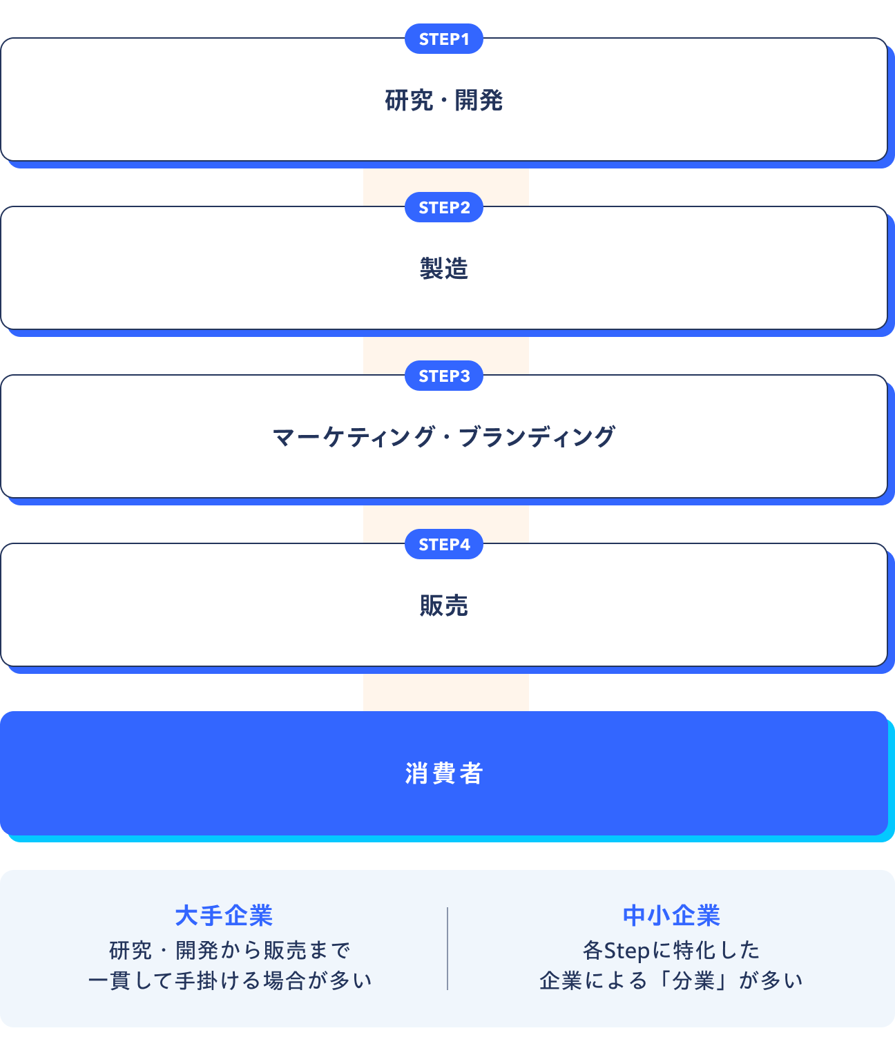 一方で、中堅・中小の化粧品メーカーは、特定の工程に特化した分業型の企業が多いです。例えば、以下のように特定の領域に注力してビジネスを手掛けるケースが存在します。