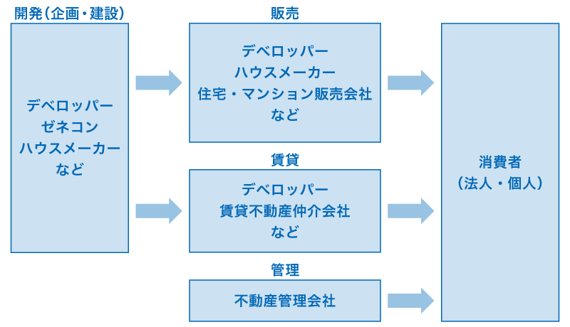 不動産業界には、大きく分けて「開発」「販売」「賃貸」「管理」という4つのビジネスモデルがあります。それぞれのビジネスモデルの特徴をまとめました。